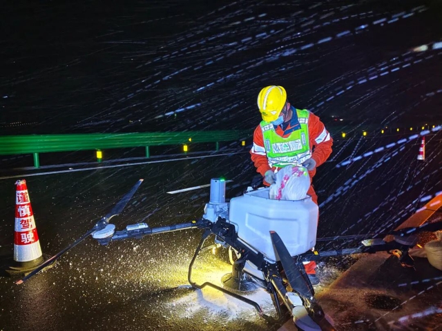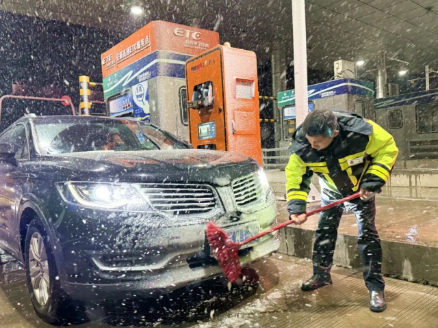 各路段管理單位與高速交警、路政等部門密切協(xié)同,聯(lián)合開(kāi)展交通疏導(dǎo)、臨時(shí)管制與應(yīng)急救援,形成“除雪保暢+交通疏導(dǎo)”雙重保障。“皖美高速大腦”智慧平臺(tái)實(shí)時(shí)監(jiān)測(cè)全省路網(wǎng)氣象數(shù)據(jù)及車流軌跡,科學(xué)調(diào)度除雪保通力量。國(guó)儲(chǔ)中心緊急調(diào)集除雪車輛馳援山區(qū)高速等重點(diǎn)路段,按照“鏟掃結(jié)合、梯次推進(jìn)”的方式,對(duì)關(guān)鍵路段展開(kāi)多輪次、不間斷除雪作業(yè)。針對(duì)橋梁、背陰路段、樞紐匝道等易結(jié)冰關(guān)鍵部位,采取“小循環(huán)、多頻次”的預(yù)防性撒布策略,嚴(yán)防路面結(jié)冰打滑。各收費(fèi)站組織人員清掃收費(fèi)廣場(chǎng)及車道,確保站區(qū)暢通,隨時(shí)提供熱水、充電、藥品等便民應(yīng)急服務(wù)。