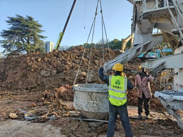 交控建工集團(tuán)一線施工人員節(jié)日期間進(jìn)行混凝土攪拌作業(yè)